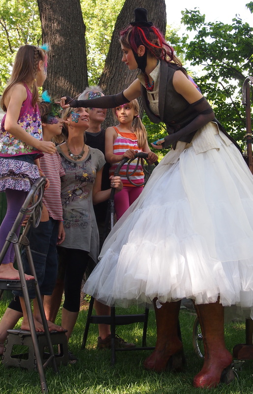 -animation maquillage pour une échassière, possiblement quelques maquilleuses au sol, tout plein de visages téméraires et des curieux…